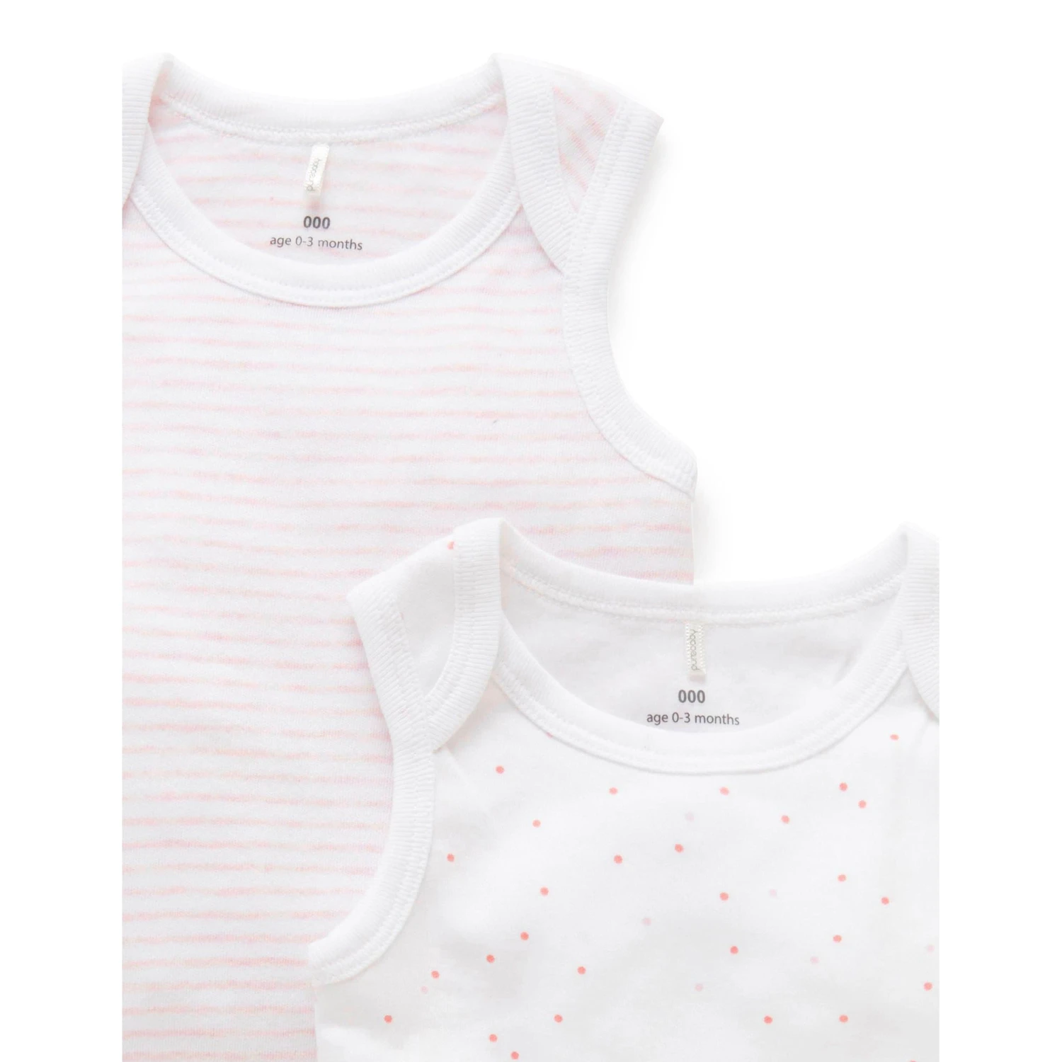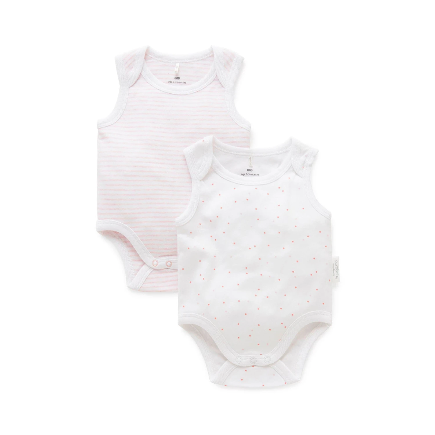Essentials two pack singlet bodysuit. The sleeveless bodysuit in the Essentials collection features a soft ribbed envelope neckline and snap summarys at the nappy for easy dressing. The all in one style ensures the stomach and back stay covered. A necessary year-round style for all newborns to wear as an individual piece or layered under cardigans and pants.