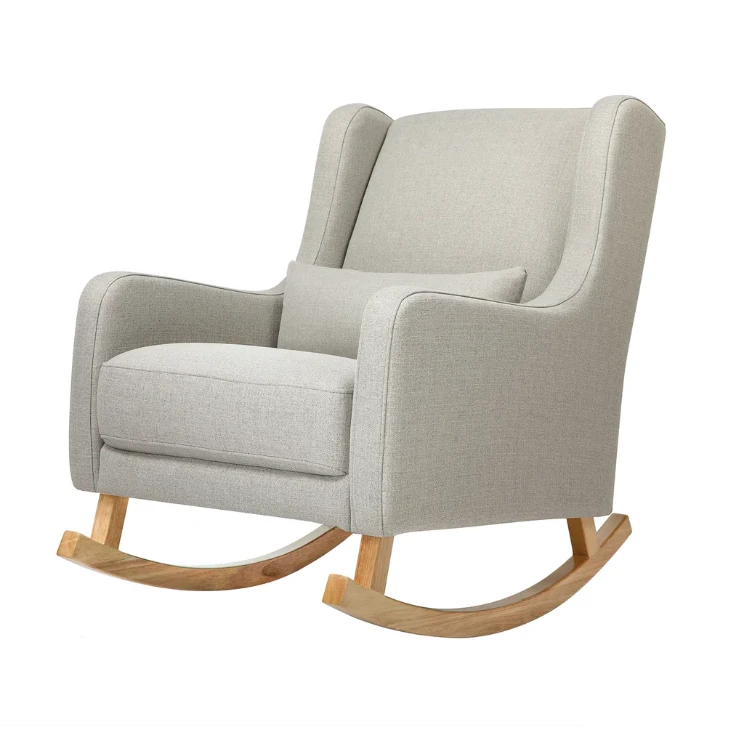 Modern Wingback Style: A modern twist on a mid-century wingback rocking chair with softly rounded edges and curved walnut-stained legs.