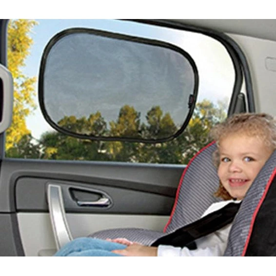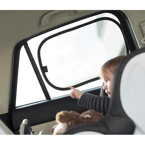 Two window shades which protect your children from the harmful UV rays and sun glare with a quick, easy on and off design.