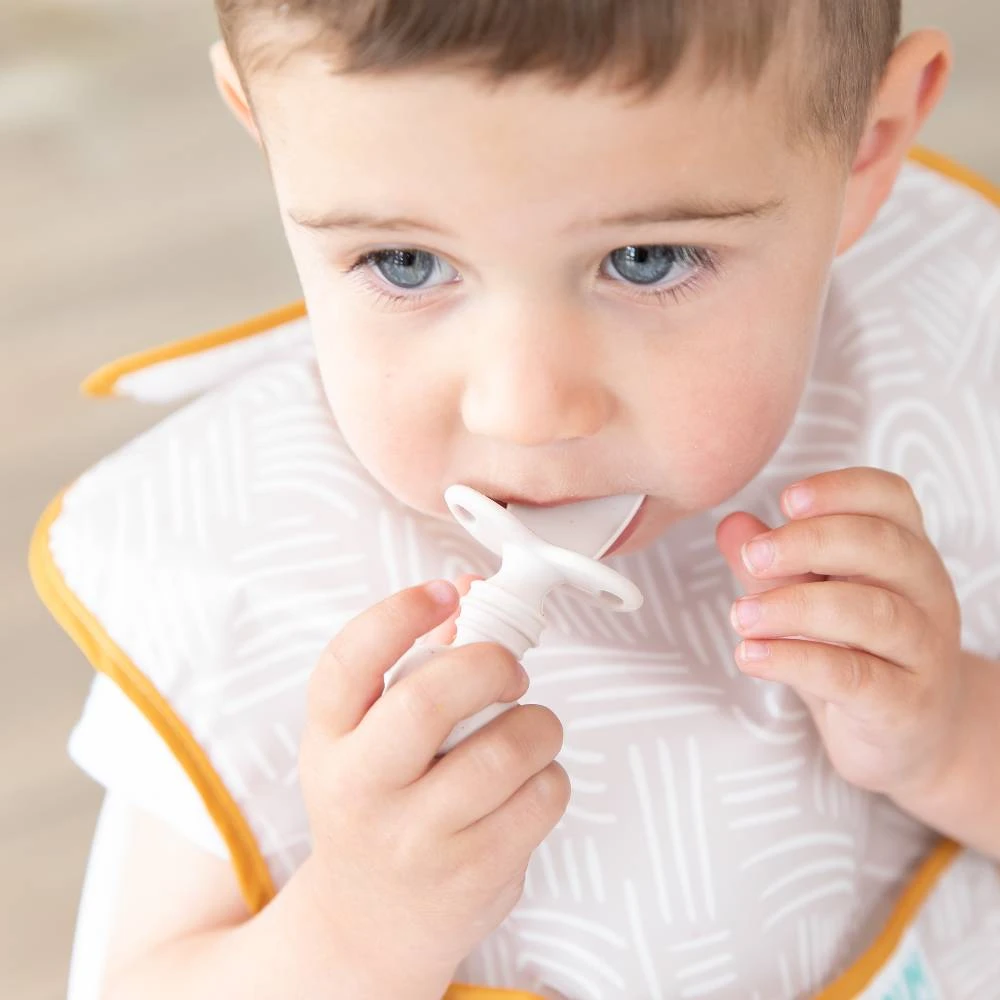 We designed Chewtensils for Stage 1 of baby-led weaning – introducing babies to the concept of holding a utensil and feeding themselves. Made from soft, textured, food-grade silicone that’s easy to grip and gentle on tender gums, with bendable heads for safety. The back of the spoon head has sensory bumps to stimulate gums. They’re perfect for dipping into puréed foods at the early part of baby led weaning. Chewtensils can be chewed on by younger babies before they’re ready to transition to silverware. They’re safe to use – made from 100% food-safe silicone.