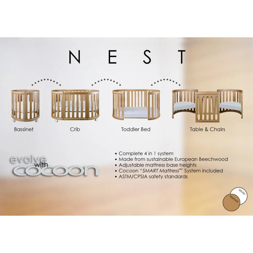 This beautifully designed piece of furniture will evolve with your child as their needs develop. From birth the NEST is a uniquely designed circle bassinet to fit in any modern house, which then evolves into a cocoon style crib then a toddler bed. It will grow with your child from their first day till the day they are off to school. To further compliment this creative design, the NEST also evolves into a table a chairs set for your child.