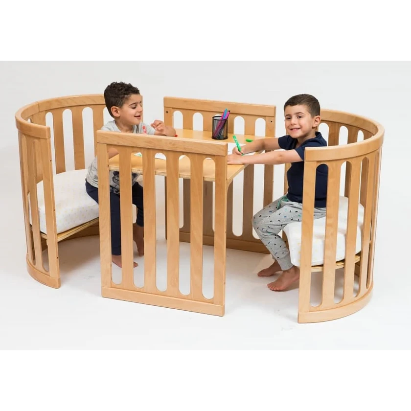Designed in Australia & made from European Beech wood, the ingenuity lies with its ability to expand and evolve from a bassinet into a cot, then a toddler bed, until it becomes a table and chair set!