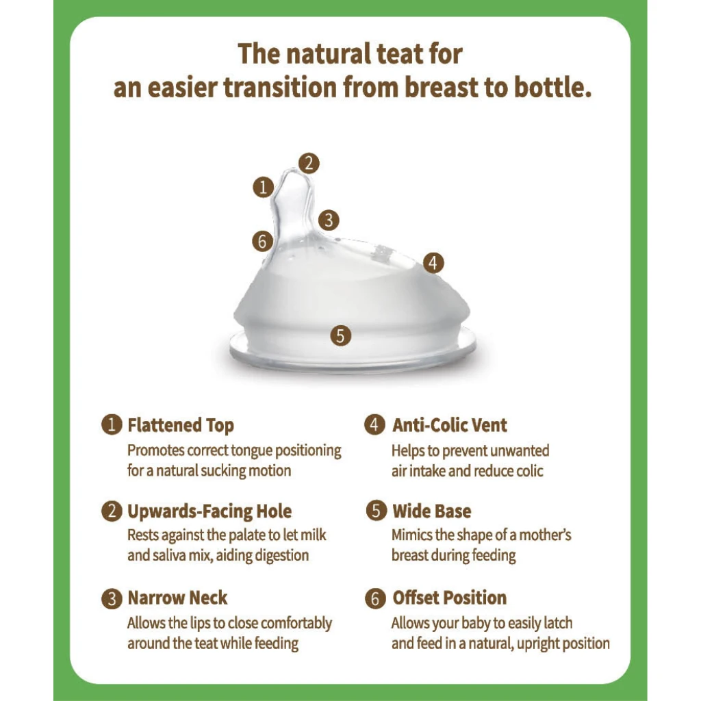 - 100% food-grade silicone nipple mimics the flex and feel of a mother’s breast