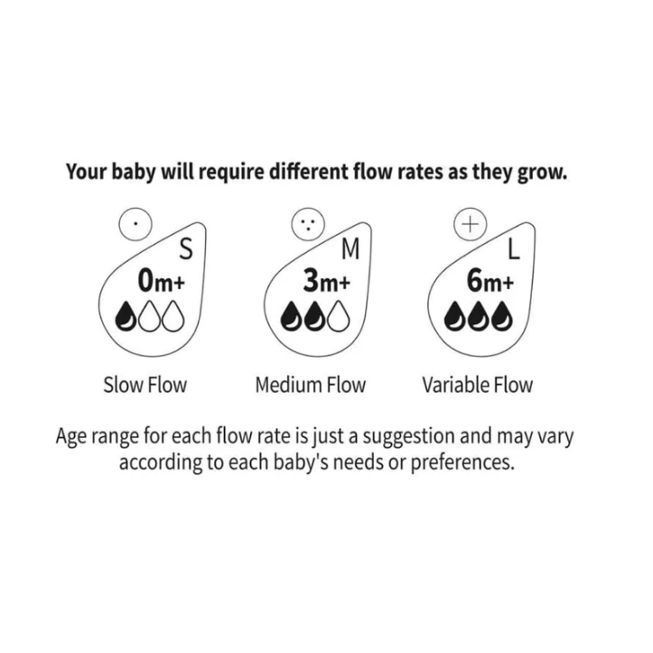 The 90ml and 120ml options contain a slow flow teat for newborns onwards. The 160ml and 180ml size contains a variable flow teat suitable for 6 months+