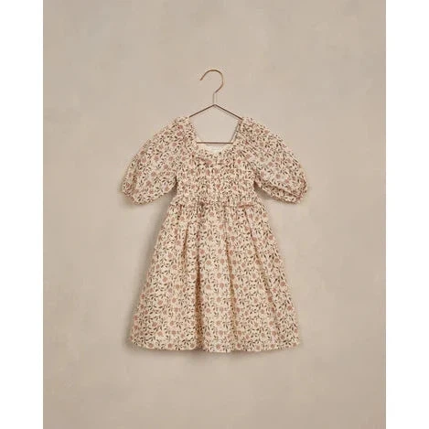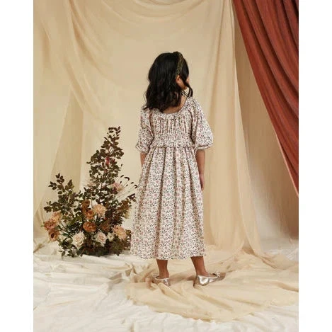 Our Junie dress features mid length sleeves and a full skirt. It has an elastic gathered waist and sweet ruffles along the neckline.