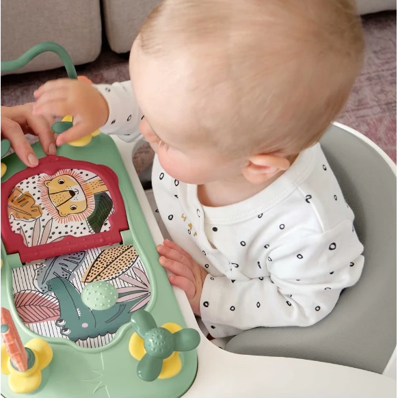 - Play Tray includes 6 interactive features including: a beaded loop, spinning flower, twisty bendy stalk, a teether and picture book with baby safe mirror