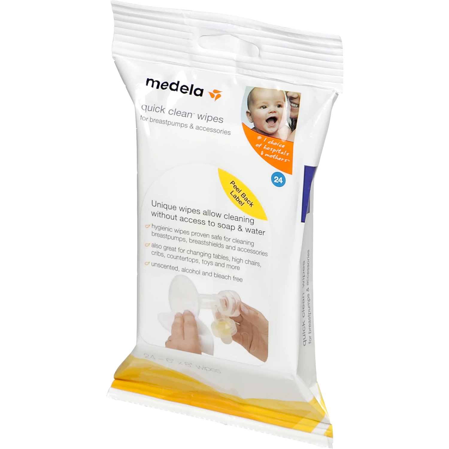 Medela Quick Clean Breastpump & Accessory Wipes offer portable cleaning, no need for soap and water cleaning after each pump session. Hygienic wipes proven safe for cleaning of breastpumps and accessories as well as high chairs, tables, cribs and countertops.