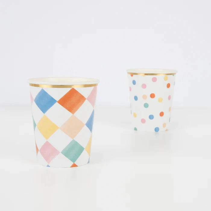 On-trend spots, stripes and checked prints will make any celebration special. The colours in these decorative cups are designed in a graduated brushstroke effect for an eye-catching look.