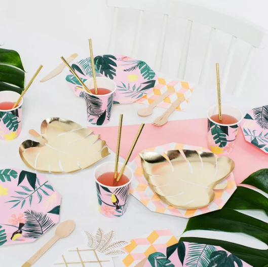 Add a splash of glitz and glamour and a healthy dose of a sunny climate to your summer party with our bright and beautiful Tropical party collection! These stylish party plates shaped like palm leaves and decorated in gold foil – think St Tropez – perfect for a touch of exotic beauty!