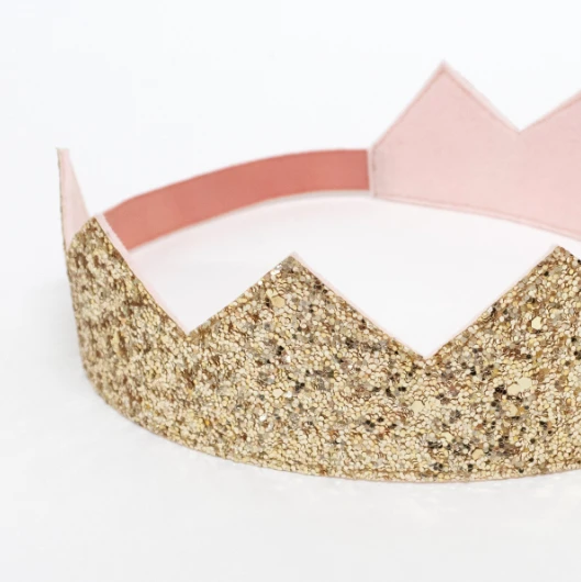 - The crown is crafted from a gold glitter fabric on the outside, pink felt on the inside, and has elastic at the back