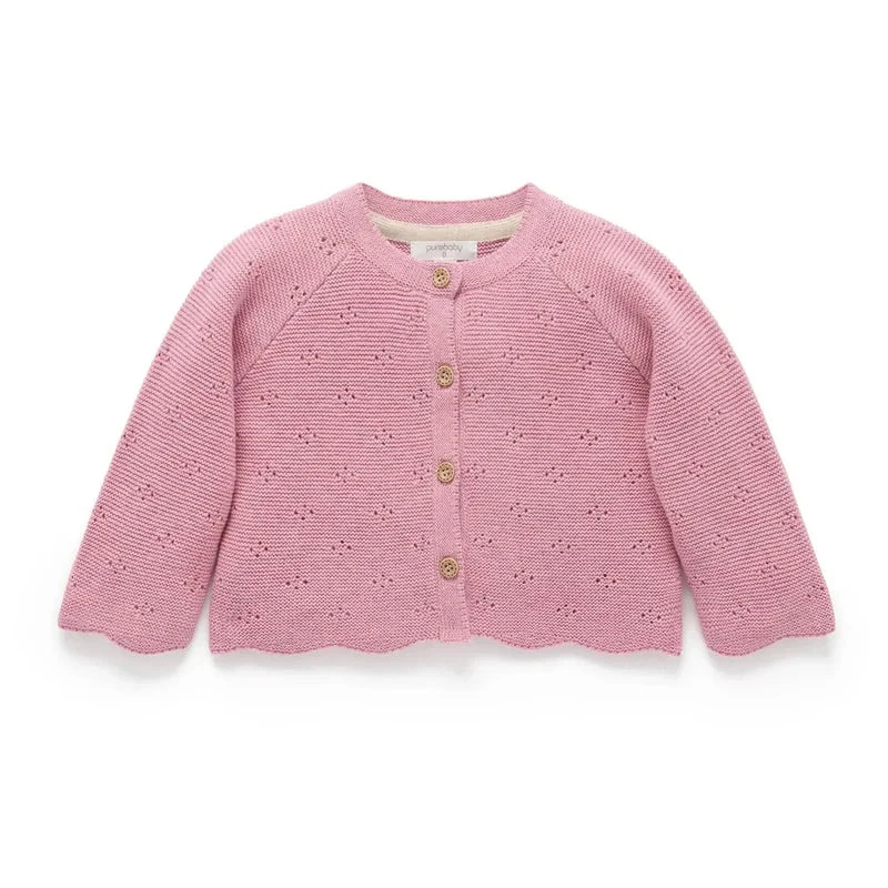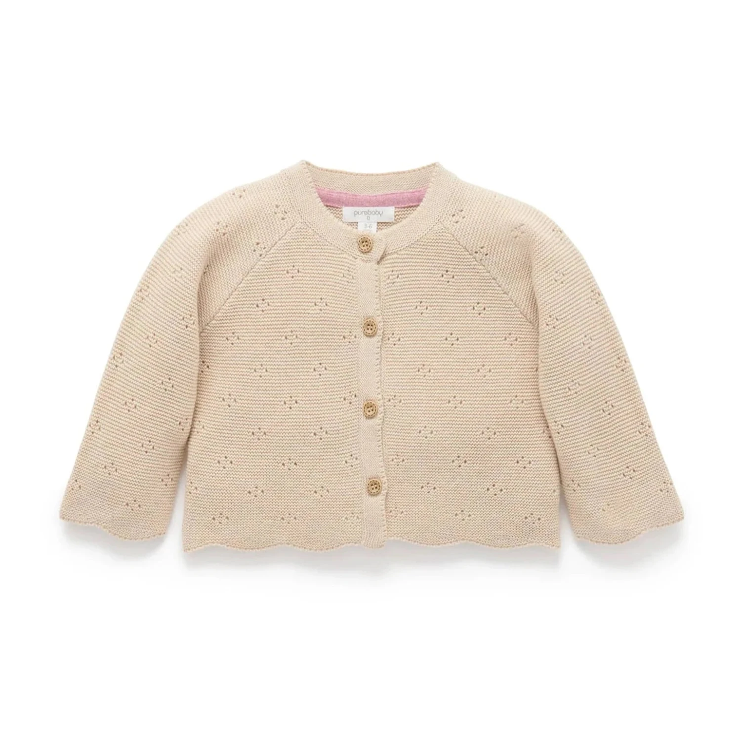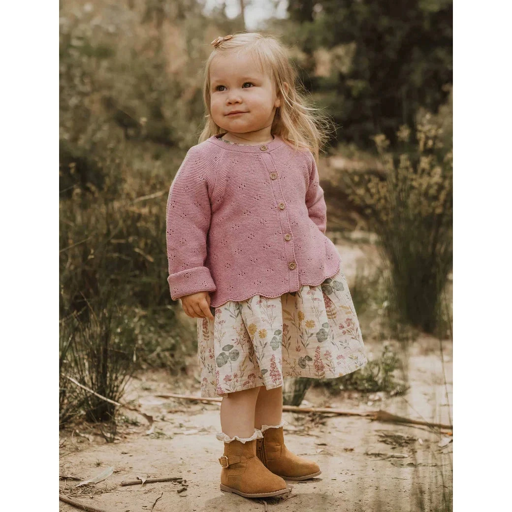 Our Posie Cardigan is the perfect winter staple to layer over any outfit. Lovely and soft, designed with a sweet scalloped hem. Made from our organic cotton and wool blend yarn with a subtle eyelet pattern. Layer over our dresses or pair with our leggings for a casual look.