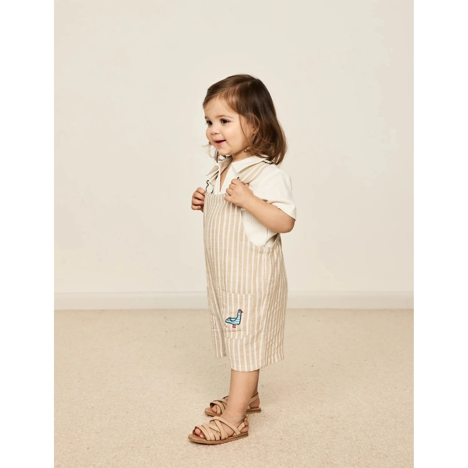 Lightweight linen blend overalls, perfect for those hot summer days or layer with a tee for extra warmth. Features an embroidered seagull.